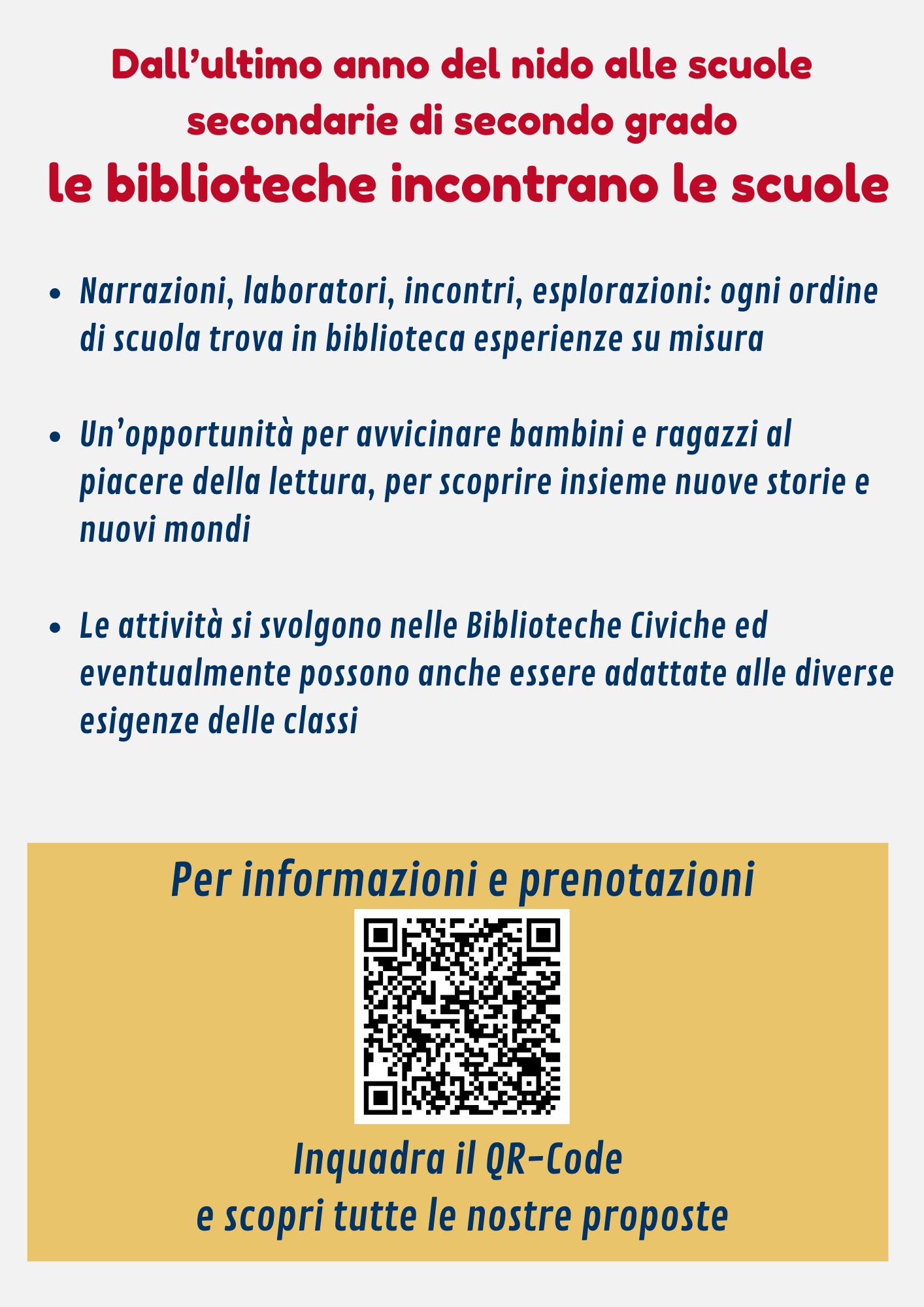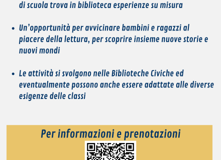 Le Biblioteche Civiche offrono a gruppi classe (dall’ultimo anno dell’asilo nido fino alle scuole secondarie di secondo grado) incontri e attività per favorire la conoscenza del proprio patrimonio e dei servizi offerti.